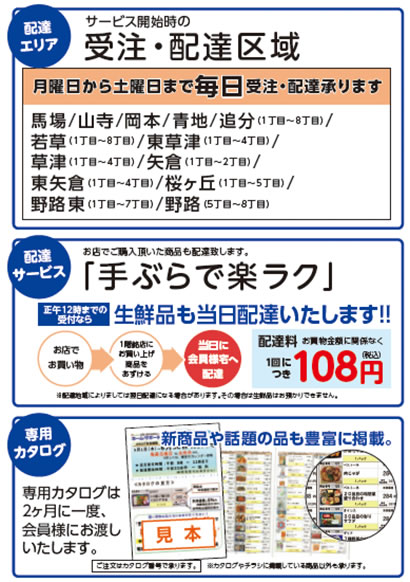 「お買い物代行」サービスは、お年寄りの方にも安心して簡単にご利用いただけます様、インターネットではなくお電話やファックスでご注文をお聞きしご自宅まで配達いたします。ご注文いただける商品は、店舗で販売している商品を中心にチラシ広告や2ヶ月に1回発行し会員様にお配りしている「ホーム・サポートサービス商品カタログ」からもご注文いただけます。 また、店舗でお買い上げいただいた商品を当日配達する「手ぶらで楽ラク」サービスや暮らしに関する軽作業を請け負う「暮らしのお手伝い」サービスも実施しております。 |
