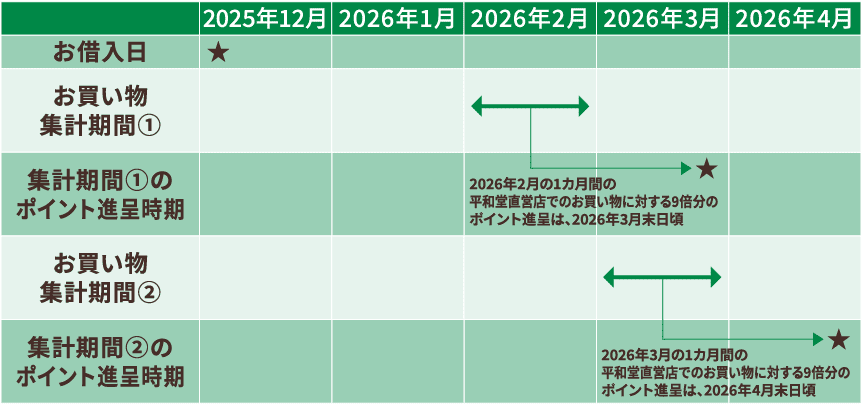 - 住宅ローン借入月の翌々月の平和堂直営店でのお買い物から適用、ポイント進呈はお買い物の翌月末
